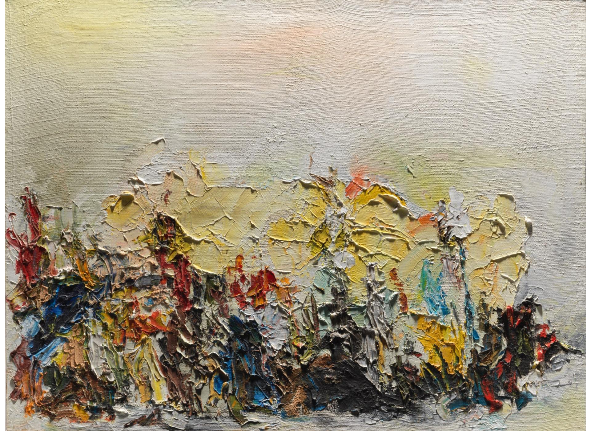 The primary graphic structure is broken by a thick juxtaposition of brushstrokes and patches dominated by contrast, opposing warm and cold colors, shadows and light, primeval Chaos and Silence.